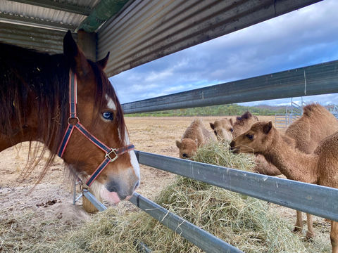 Come Visit the farm! Here, you can hand-feed, cuddle, and pat a variety of friendly animals, including Heavy Horses, water buffaloe, chickens, ducks, peafowl, sheep, calves, and even camels. Don’t miss the chance to meet cute friendly goats, and get a kiss from Gidget the camel!